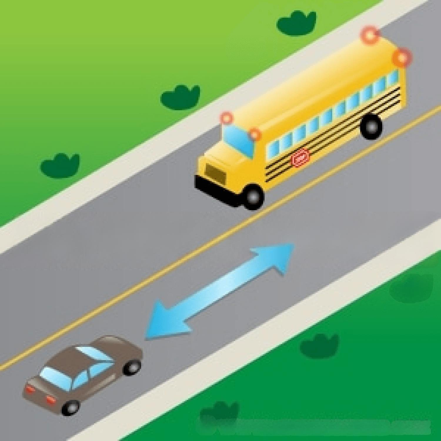 Stop at least 20 m away if approaching the bus from behind or stop a safe distance from the bus if approaching from the opposite direction. Proceed only when the bus’ signal lights are no longer flashing